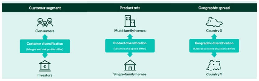 The company specializes in spreading risks by building different types of homes and targeting different markets. Investors often pay a portion of the price upfront, while individuals only pay upon occupancy of the house. Although sales to individuals generate higher margins, the risk is spread through customer diversification.