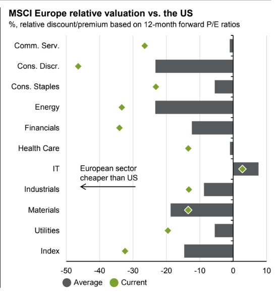 The relative valuation of sectors in Europe compared to their American counterparts deviates sharply from historical figures, with IT and Materials being the only real exceptions. In other words: investors are paying a much higher premium for the same earnings in US stocks than usual, or the discount for European companies’ earnings has deepened. Based on the first chart, it’s likely the former.